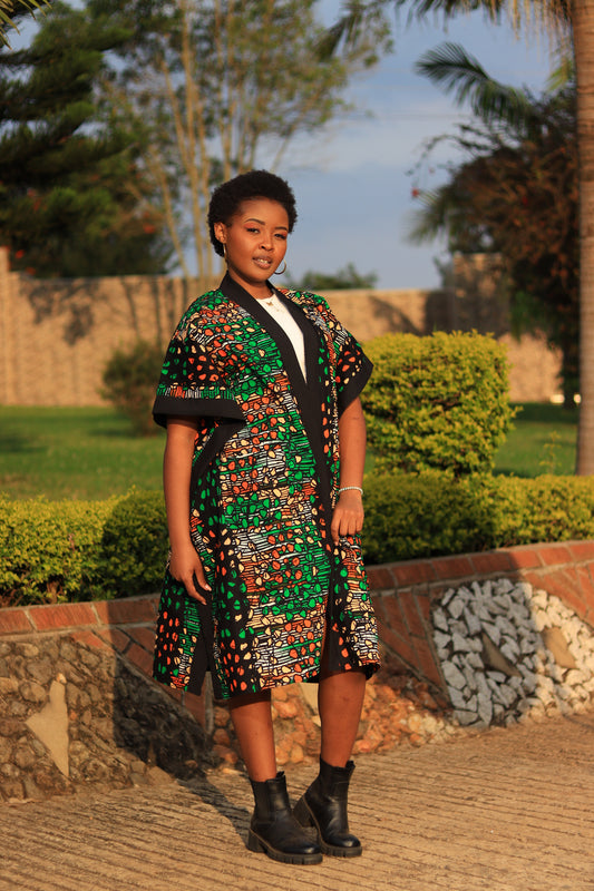 Embrace the boldness of African fashion with our Zuri Kimono. Crafted from authentic Ankara fabric known for its durability and vibrant patterns, this kimono showcases an exquisite design that combines geometric precision with organic fluidity.